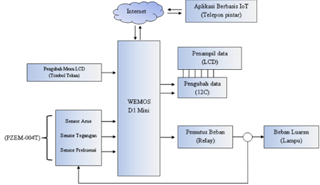 diimplementasikan menggunakan Wemos D1 mini, modul sensor PZEM-004T, relay, LCD I2C, dan aplikasi Blynk